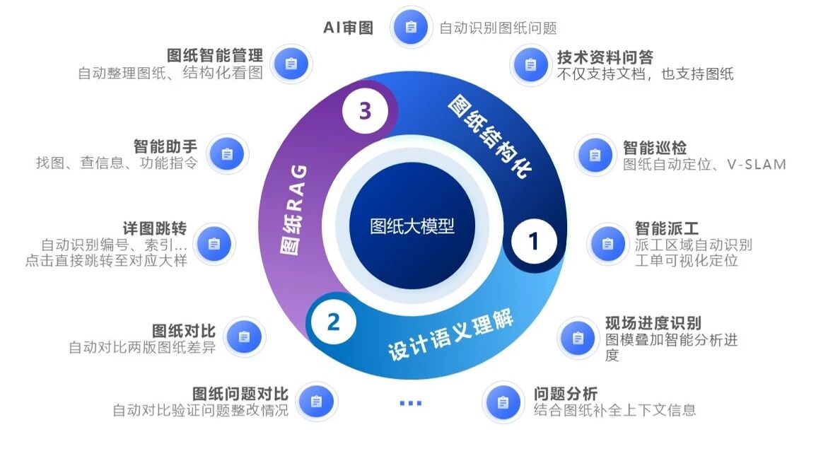 万翼图纸大模型技术能力,已在审图、图纸管理协作、工地数据采集和空间资产可视化等建筑产业链条的业务场景中得以应用: