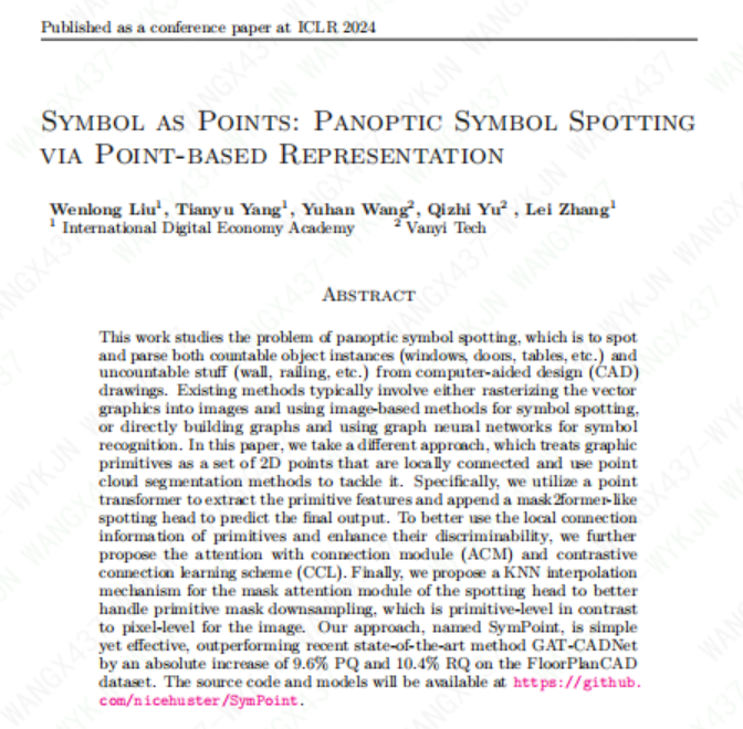 万翼科技在2024年发布了矢量图识别模型SymPoint的研究论文被2024国际顶级AI会议ICLR收录。ICLR会议由深度学习三大巨头之二的Yoshua Bengio和Yann LeCun牵头创办,在最新的谷歌学术期刊和会议影响力排名中位列计算机学科前列。